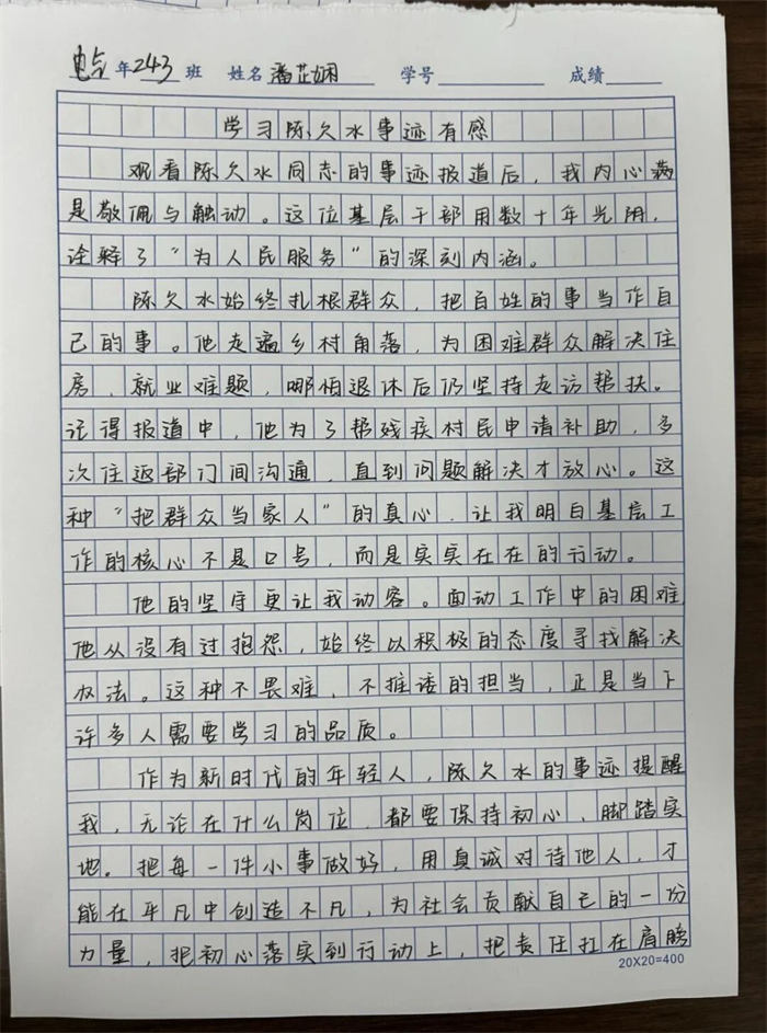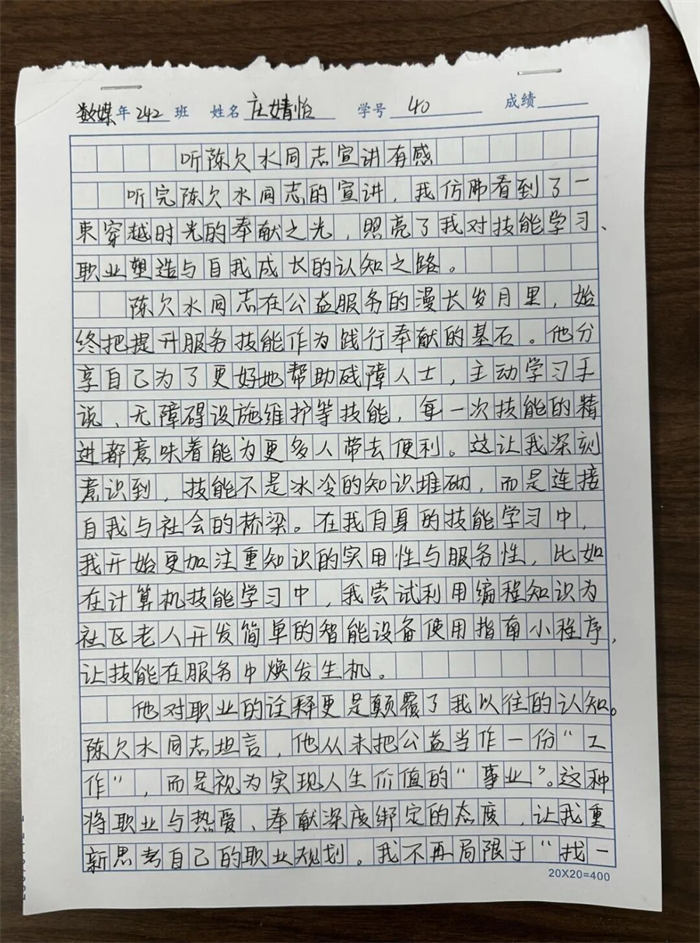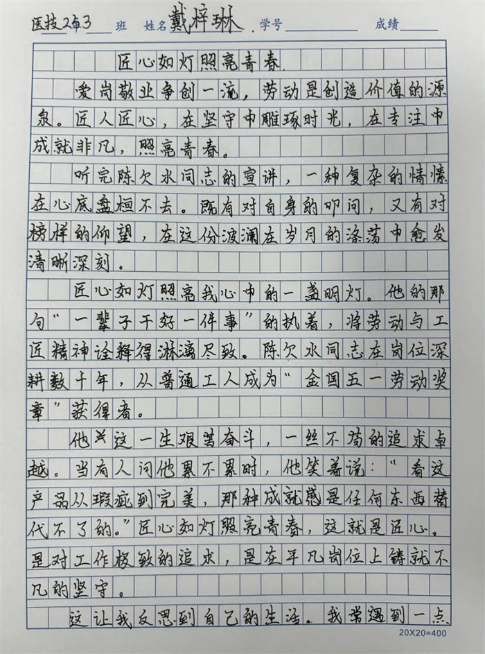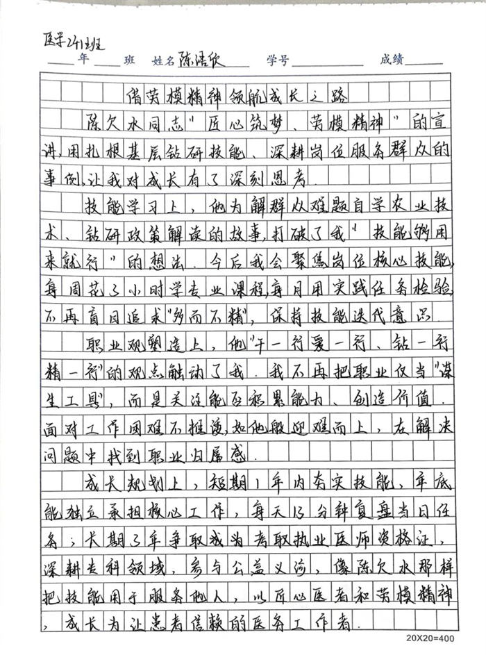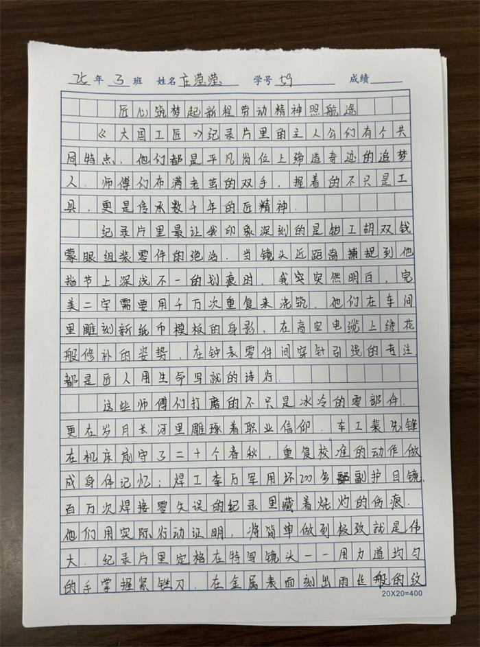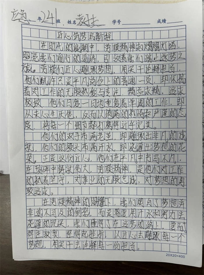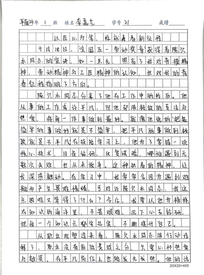 為深化學(xué)習(xí)成效,讓勞模精神真正融入育人全過(guò)程,學(xué)校同步啟動(dòng)“勞模精神照我心”主題征文比賽,鼓勵(lì)學(xué)生結(jié)合聆聽感受與自身實(shí)際,暢談對(duì)勞動(dòng)價(jià)值、青春擔(dān)當(dāng)?shù)乃伎?。比賽得到各年?jí)積極響應(yīng),共收到來(lái)稿30余篇,同學(xué)們用文字書寫敬意、抒發(fā)志向,紛紛表示要以陳欠水同志為榜樣,刻苦學(xué)習(xí)、服務(wù)社會(huì),讓奮斗成為青春最亮麗的底色。