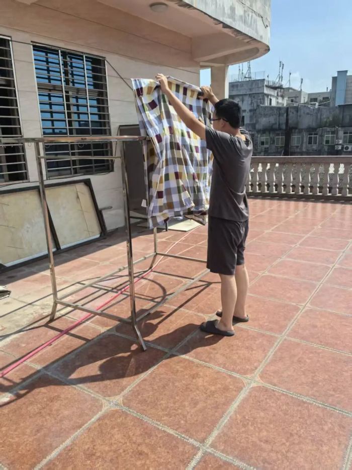 我抱著厚棉被,胳膊酸得發(fā)抖,陽光把灰塵照成碎金——忽然想起媽媽每天早起洗曬的背影,同一根鐵絲,她掛的是家的重量,我曬的是遲到的感恩。
