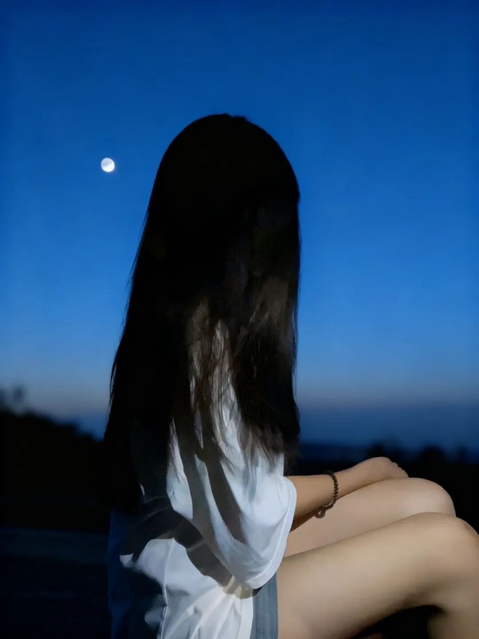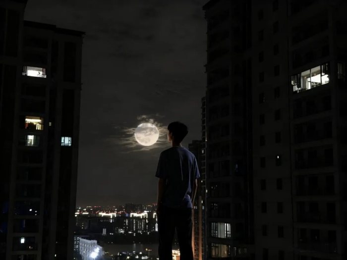 樓頂望中秋月,暮色里微光,風(fēng)輕云淡,心境澄澈,美好自留心間。