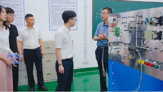 遲巖校長向團縣委一行介紹了我校發(fā)展藍圖,指導(dǎo)組一行參觀了飛機維修、無人機應(yīng)用技術(shù)、機電一體化等實訓(xùn)教室,觀摩體驗了飛機模擬器操作演練的技能學(xué)習(xí)過程。